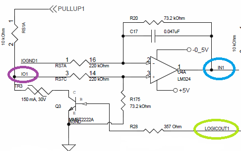 To understand how these settings work, one can refer to the attached channel schematic, which shows the circuitry for one channels in the frame. The output connection is IO1 (purple oval). LogicOut1 (green oval) turns on/off the transistor, which pulls IO1 to ground or not. The voltage readings are taken at IN1 (blue oval). When the transistor is ON, the IO1 signal is pulled to ground no matter what the PULLUP1 is set to and no matter what the outside signal might be. This condition disables this channel as an input. The software state that turns off the transistor is setting the output property to TRUE.