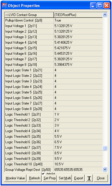 If accesses these cards via VewProp and opens the first LVIO Contact Group Object, one will see properties such as those shown in the attached screenshot. Properties 2p11 – 2p18 are the current DC voltage readings. For normal amplifiers, one should see values just above 5V as in the screenshot.